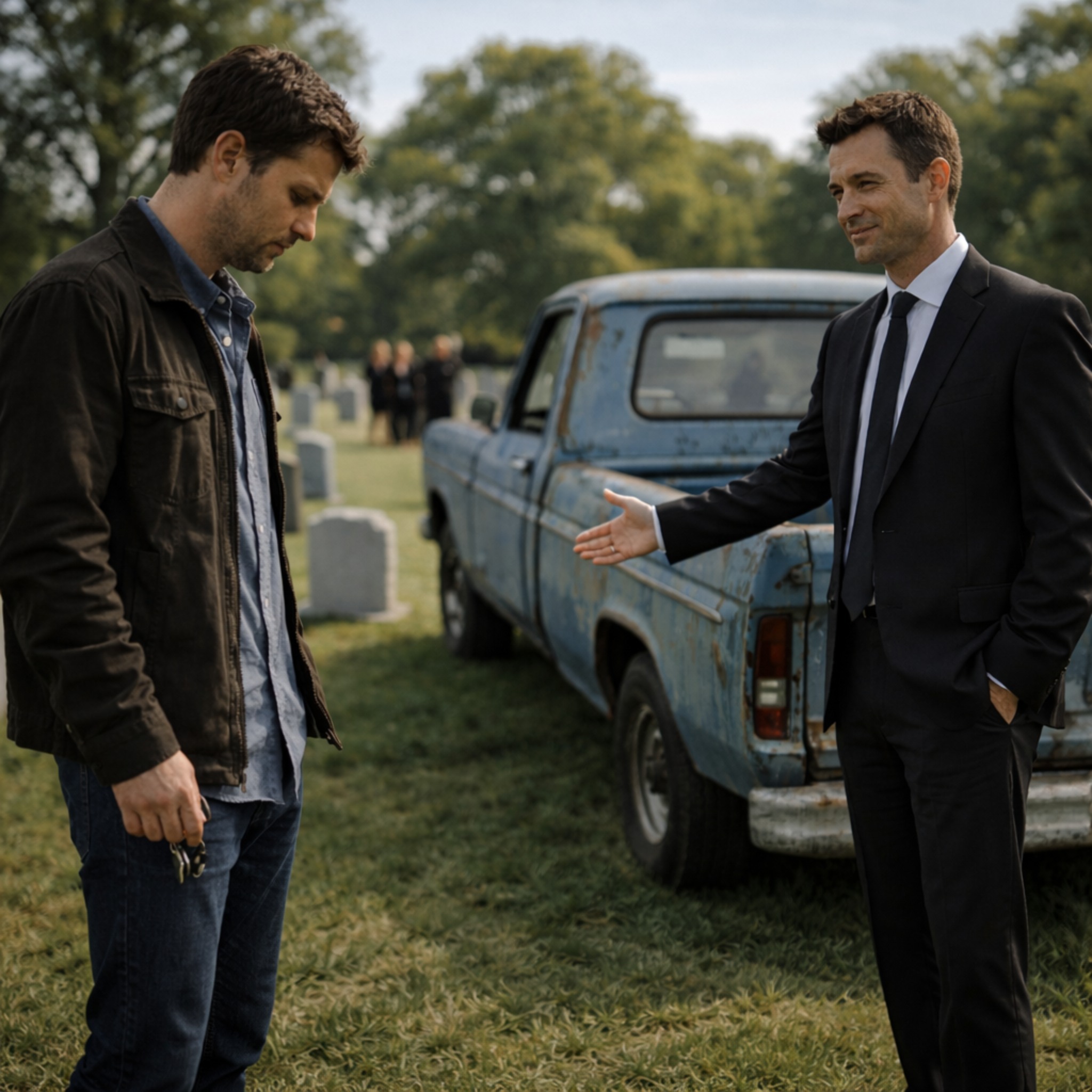 Le mini-camion était garé à l’entrée du cimetière, sa peinture rouge délavée et son pare-chocs cabossé lui donnant exactement l’apparence décrite par Patrick : une relique sans valeur d’une autre époque.