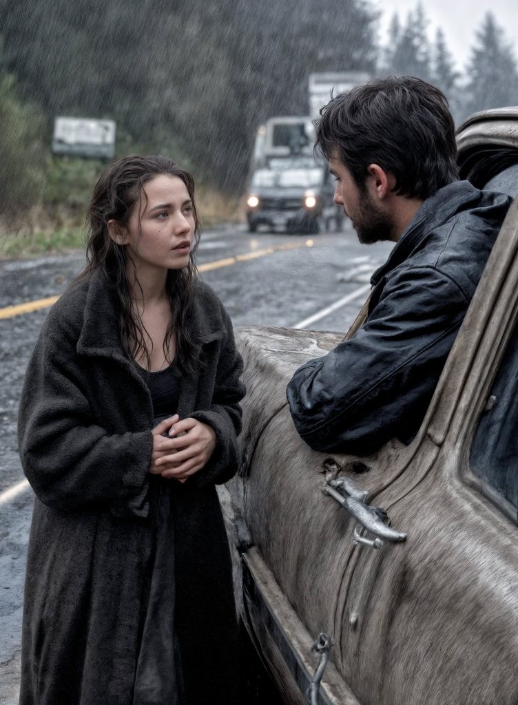 Fragile, presque spectrale, elle semblait faite de la nuit elle-même — fondue dans les ombres et pourtant encore en train de lutter pour garder sa place dans la réalité. Un long manteau détrempé lui collait au corps ; ses cheveux s’accrochaient à son visage, et ses yeux, pris dans la lumière des phares, brillaient à la fois de désespoir et d’espoir. Elle n’agitait pas la main comme une autostoppeuse, mais comme quelqu’un qui est en train de se noyer et qui s’accroche à la dernière brindille.