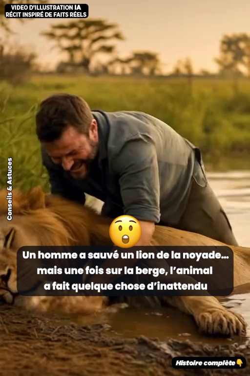 Alors qu’il savourait les dernières teintes orangées du couchant au bord de l’eau, Julien distingua une silhouette sombre se débattant avec peine contre le courant. Un lion, aussi noble qu’impressionnant, visiblement en grave détresse.