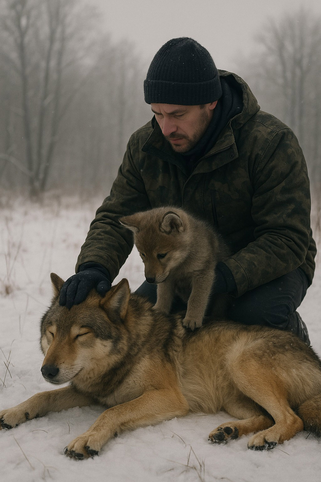 En avançant péniblement sur le sentier gelé, son regard fut attiré par une forme sombre, immobile, posée sur le manteau blanc. En s’approchant, son cœur se serra : une louve était étendue là, visiblement en difficulté, tandis qu’un petit tournait autour d’elle, agité et inquiet. La peur monta immédiatement. Chacun sait qu’un animal sauvage peut réagir de manière imprévisible. Pourtant, quelque chose en lui refusa de détourner les yeux et de poursuivre sa route comme si de rien n’était.