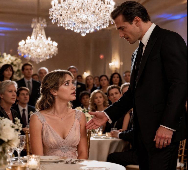 Amelia était assise seule au fond de la salle, les mains nerveusement croisées sur ses genoux, le regard fixé sur une flûte de champagne intacte. Sa robe fleurie — empruntée, un peu passée — ne parvenait pas à cacher la fatigue dans ses yeux. De l’autre côté de la pièce, les couples se balançaient gracieusement sous les lustres dorés, tandis que des chuchotements tournaient autour de sa table comme des vautours.