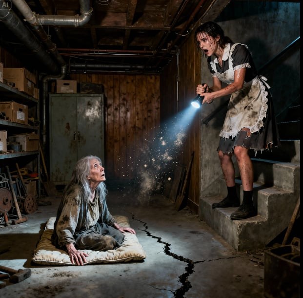 Le cœur battant, Clara s’empara d’une petite lampe et descendit l’escalier. L’odeur d’humidité, de poussière et de pierre froide l’enveloppa comme une condamnation. Dans l’ombre, quelque chose remua : un souffle, un râle… puis des yeux fatigués brillèrent dans l’obscurité. Cette nuit-là, la jeune domestique découvrit le secret le plus effroyable de la famille del Monte — un secret qui allait bouleverser son existence et révéler l’identité véritable de la femme enfermée dans la cave.